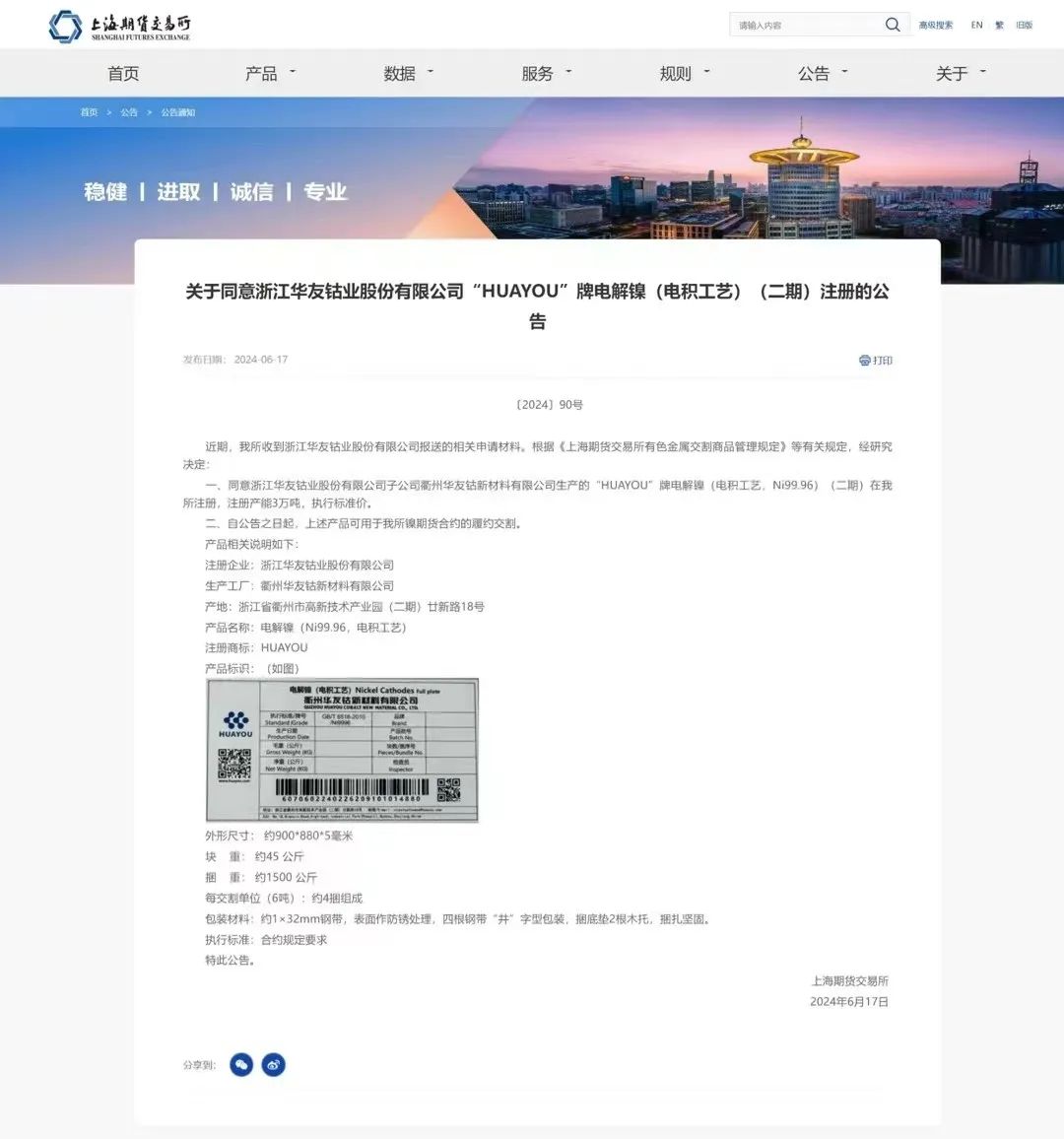 “HUAYOU”牌電解鎳(二期)自2024年1月份起,公司與上海期貨交易所積極溝通,經(jīng)過嚴(yán)格的實(shí)地考察和抽樣檢驗(yàn),最終上海期貨交易所認(rèn)定華友鈷業(yè)生產(chǎn)的“HUAYOU”牌電解鎳(二期)符合交割品牌的各項(xiàng)要求,允許成為交割品牌,自此印有“HUAYOU”標(biāo)識的電解鎳將再次走進(jìn)客戶心中。