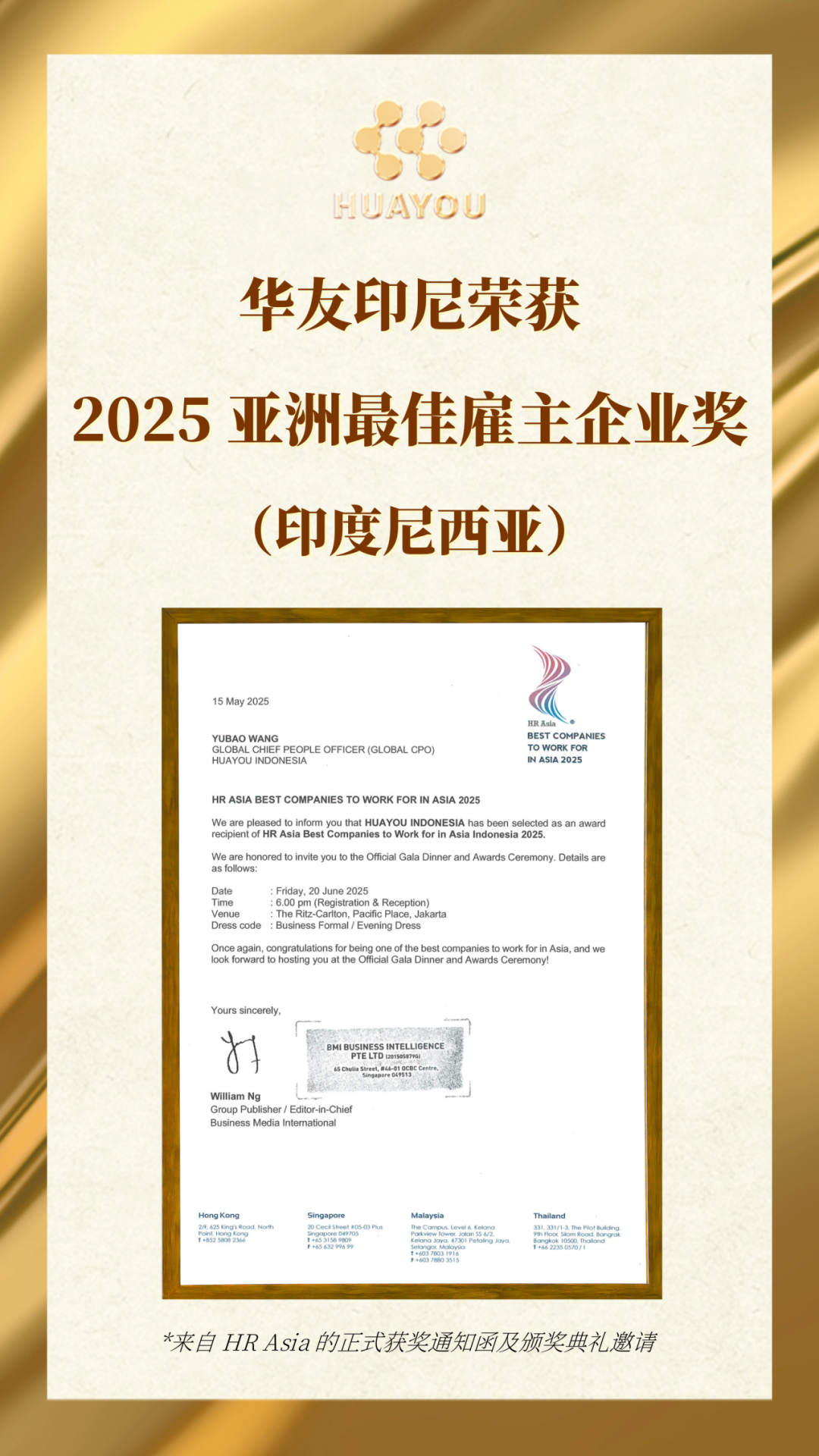 5月15日,亞太權威人力資源機構 HR Asia 公布“2025亞洲最佳雇主企業獎”(Best Companies to Work for in Asia)評選結果。華友首次參評即榮膺印尼地區最佳雇主企業品牌稱號,這是華友在印尼發展歷程中的重要里程碑,更是對公司長期踐行本地化人才戰略和履行企業社會責任的高度認可。