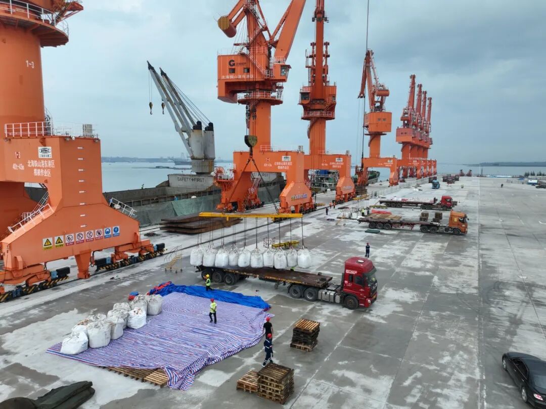 在玉林海港碼頭,工人們正有條不紊地進行緊張的裝卸作業(yè),裝車后分批運往華友廣西園區(qū)。本次鋰精礦的成功接卸,極大提升了華友廣西園區(qū)原料供應(yīng)的自主性與穩(wěn)定性。相比原有路線,直接到貨玉林海港碼頭每次節(jié)省廣西華友原料運輸近100多公里陸運路程,有效降低了物流成本和運輸時間,顯著增強了園區(qū)的市場響應(yīng)能力和產(chǎn)品綜合競爭力。這不僅是簡單的“少走彎路”,更是華友整合國內(nèi)外物流資源、優(yōu)化全球布局的核心體現(xiàn)。