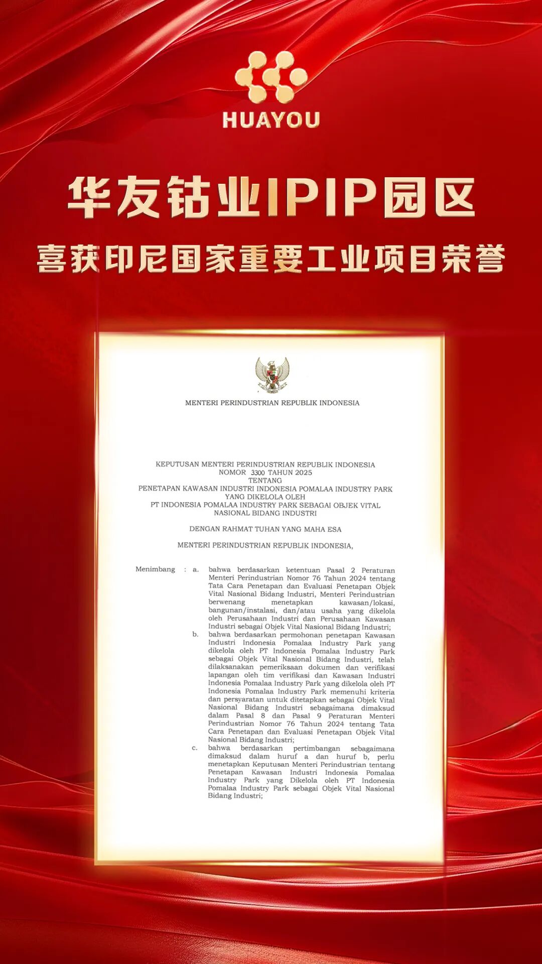 國家級認可!華友IPIP園區獲印尼國家重要工業項目榮譽