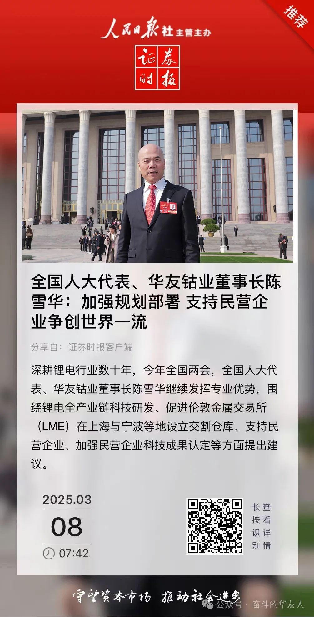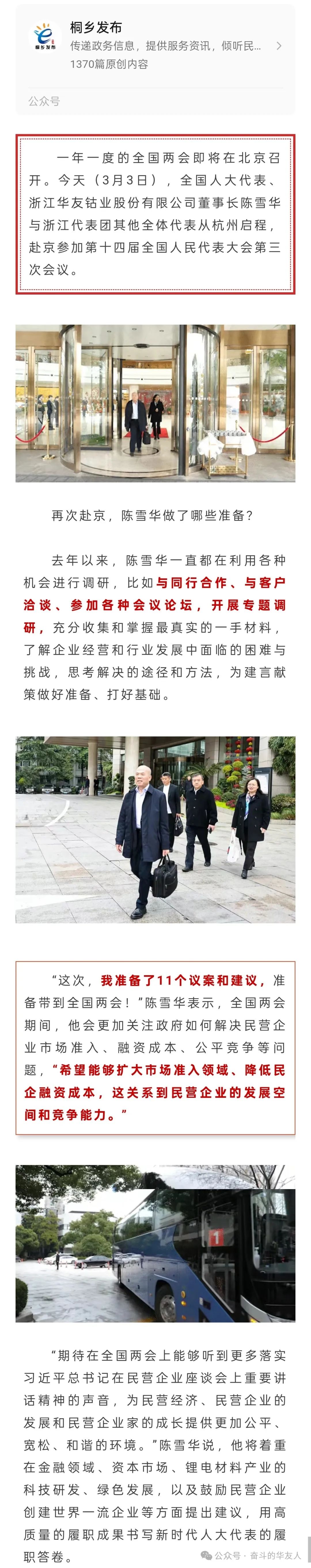 全國“兩會”期間,全國人大代表、華友鈷業董事長陳雪華聚焦民營企業、新能源鋰電產業積極建言獻策,他的建議受到《浙江衛視新聞聯播》、《上海證券報》、《證券時報網》、《財聯社》、《桐鄉發布》等主流媒體廣泛關注。